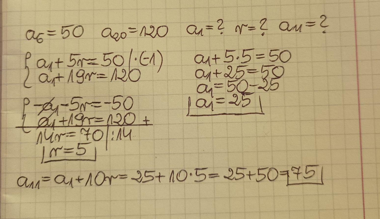 W ciągu arytmetycznym mamy: a6=50 oraz a20=120. Oblicz a1, różnicę r oraz wyraz a11.