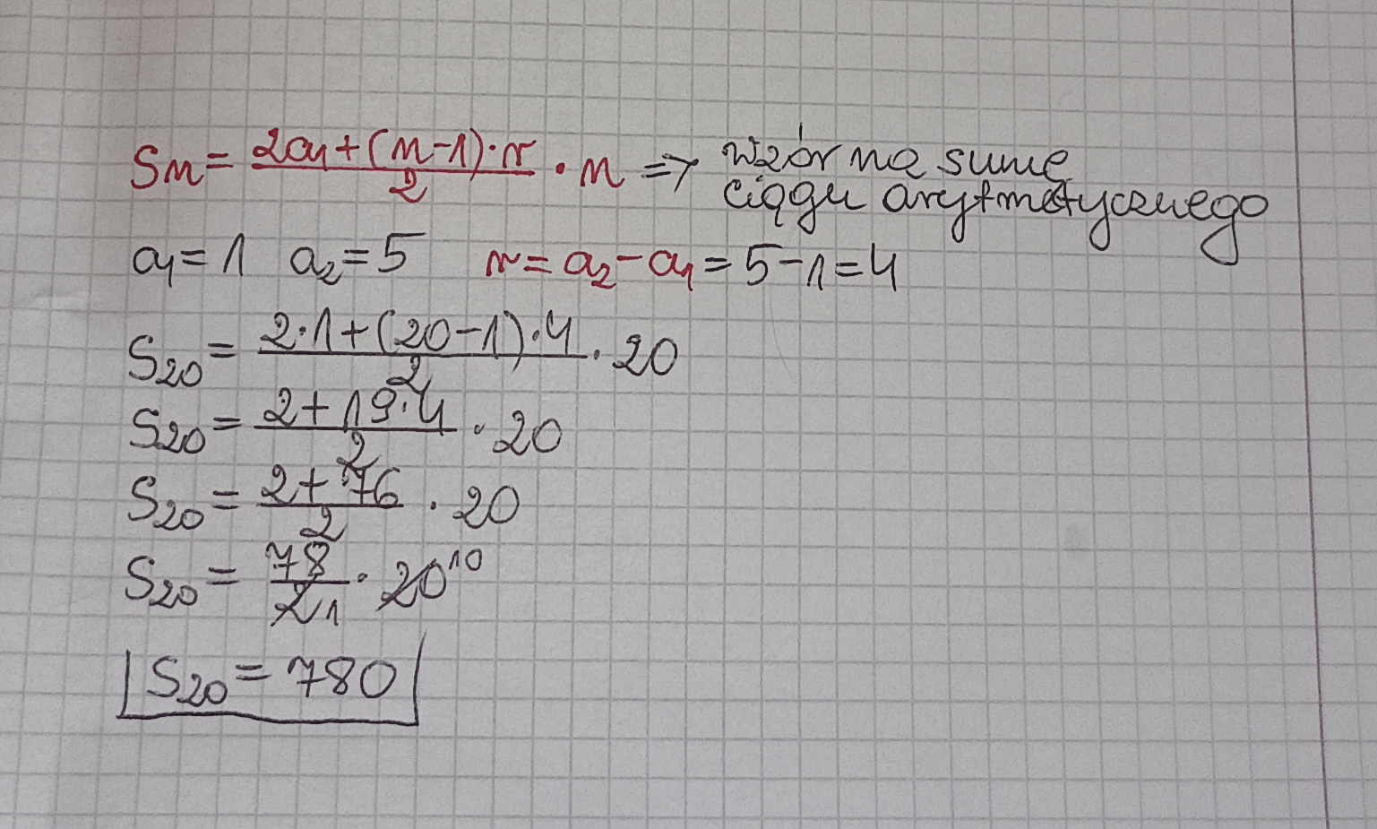 Oblicz sumę kolejnych dwudziestu wyrazów ciągu 1+5+9+... korzystając ze wzoru na sumę ciągu arytmetycznego.