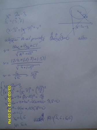 Kąt między promieniem SA okręgu a styczną y=2x-3 ma
