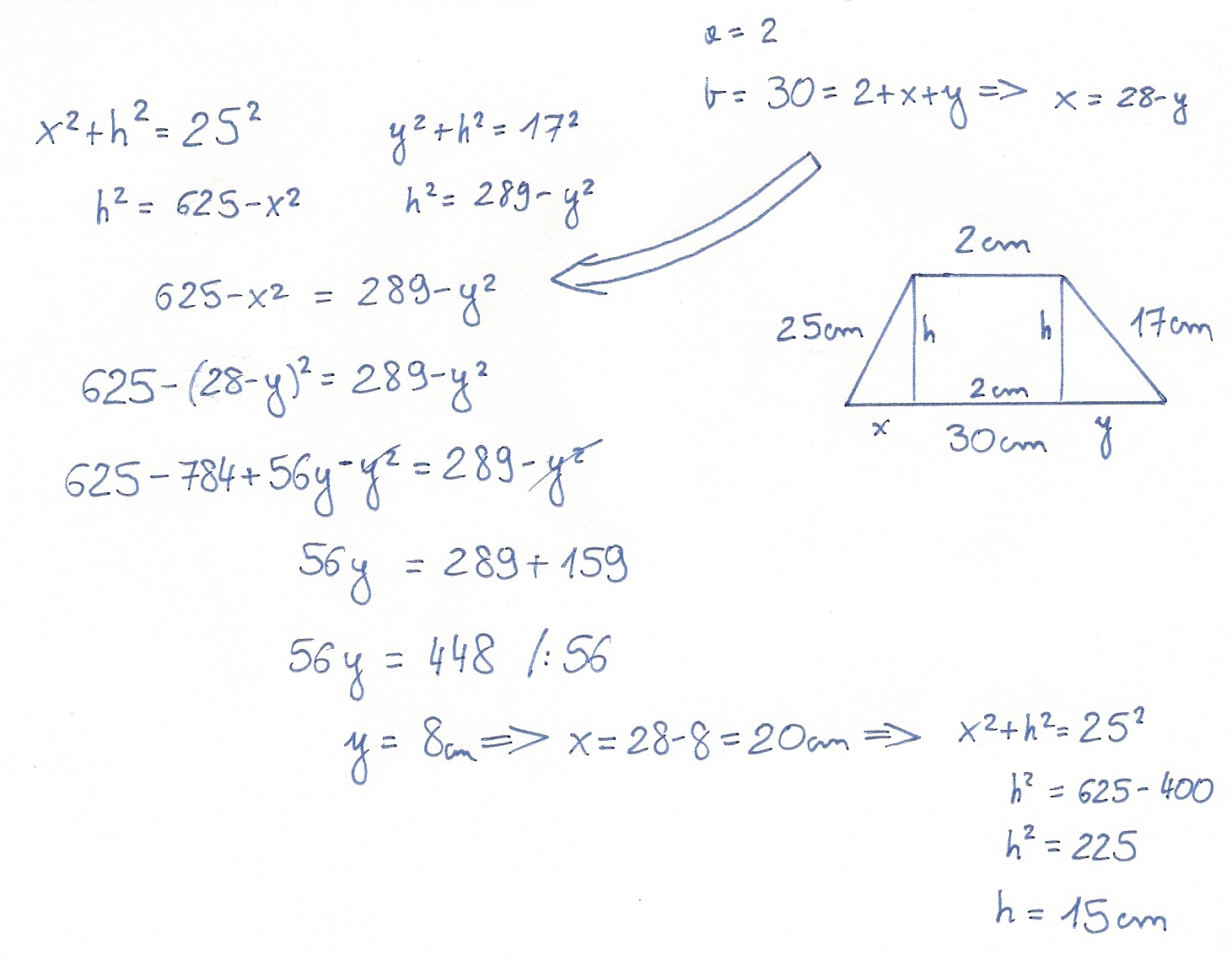 wyznacz wysokość trapezu, którego podstawy mają długość 2cm i 30cm a ramiona 25cm i 17cm.