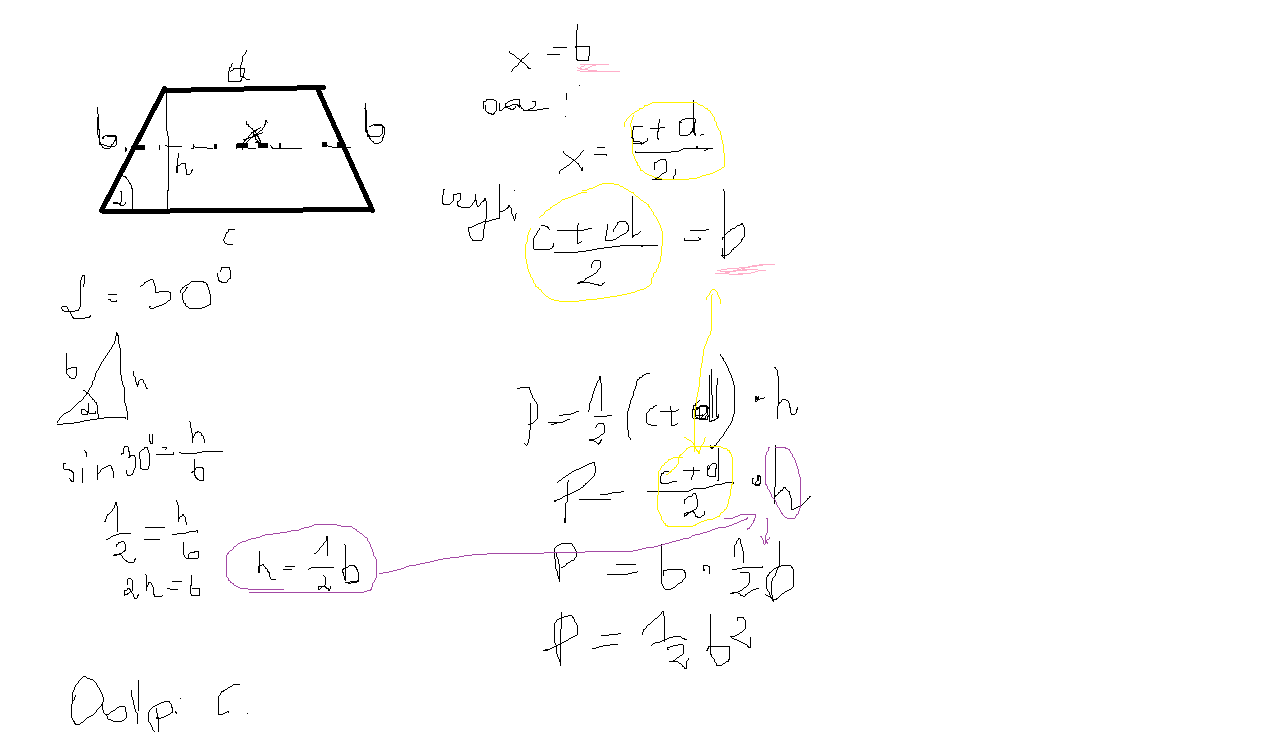 . Ramię ma długość b cm i jest równe odcinkowi łączącemu środki ramion trapezu. Pole powierzchni trapezu wynosi: