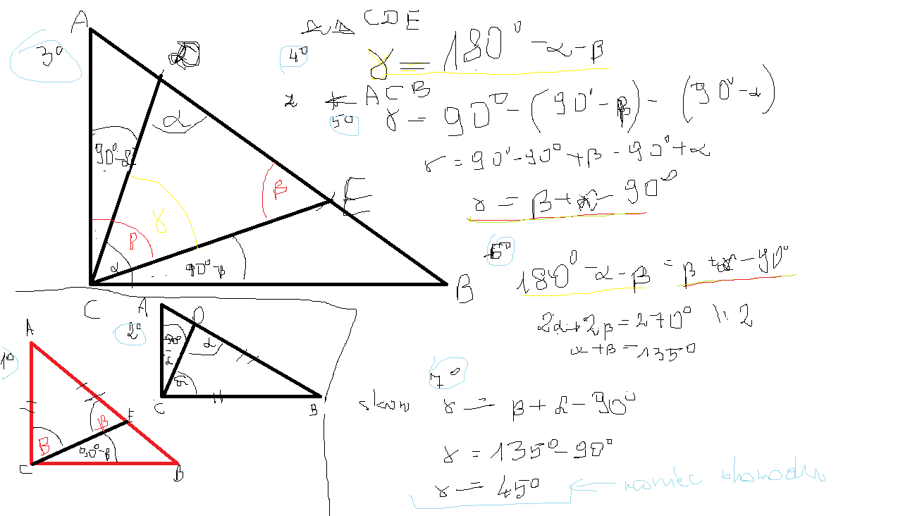 Na przeciwprostokątnej Ab trójkąta prostokątnego ABC wybrano punkty D i E w taki sposób, by AC=AE oraz BC=BD. Udowodnij, że kąt DCE=