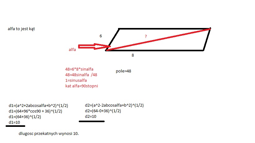 W rownolegloboku dlugosci bokow sa rowne 6 i 8 a jego pole wynosi 48. oblicz dlugosci przekatnych