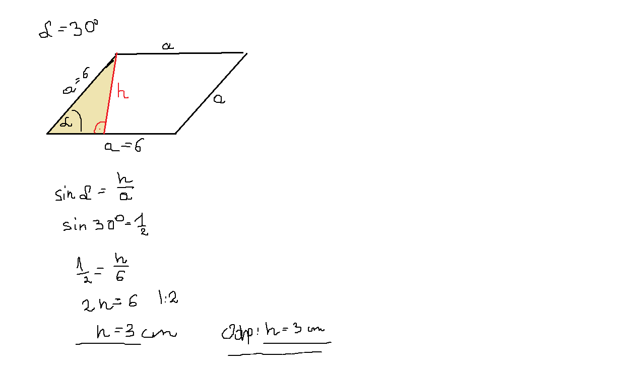 Oblicz wysokość rombu, którego bok ma długość 6 cm, a kąt ostry 30 stopni