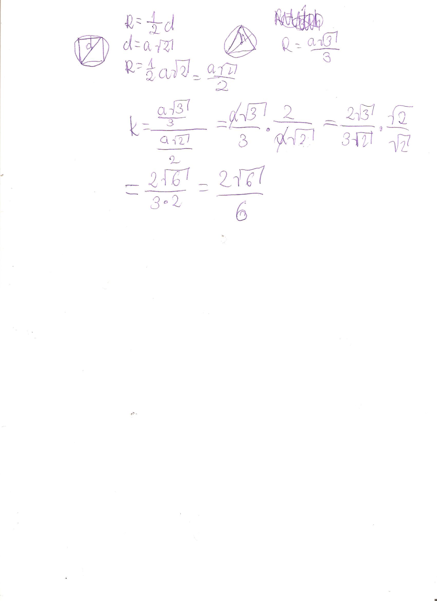 Wykaż, że jeśli kwadrat i trójkąt równoboczny mają boki równej długości to stosunek promienia okręgu opisanego na trójkącie równobocznym do długości promienia okręgu opisanego na kwadrat jest równy 2 pierwiastek 6 przez 6.