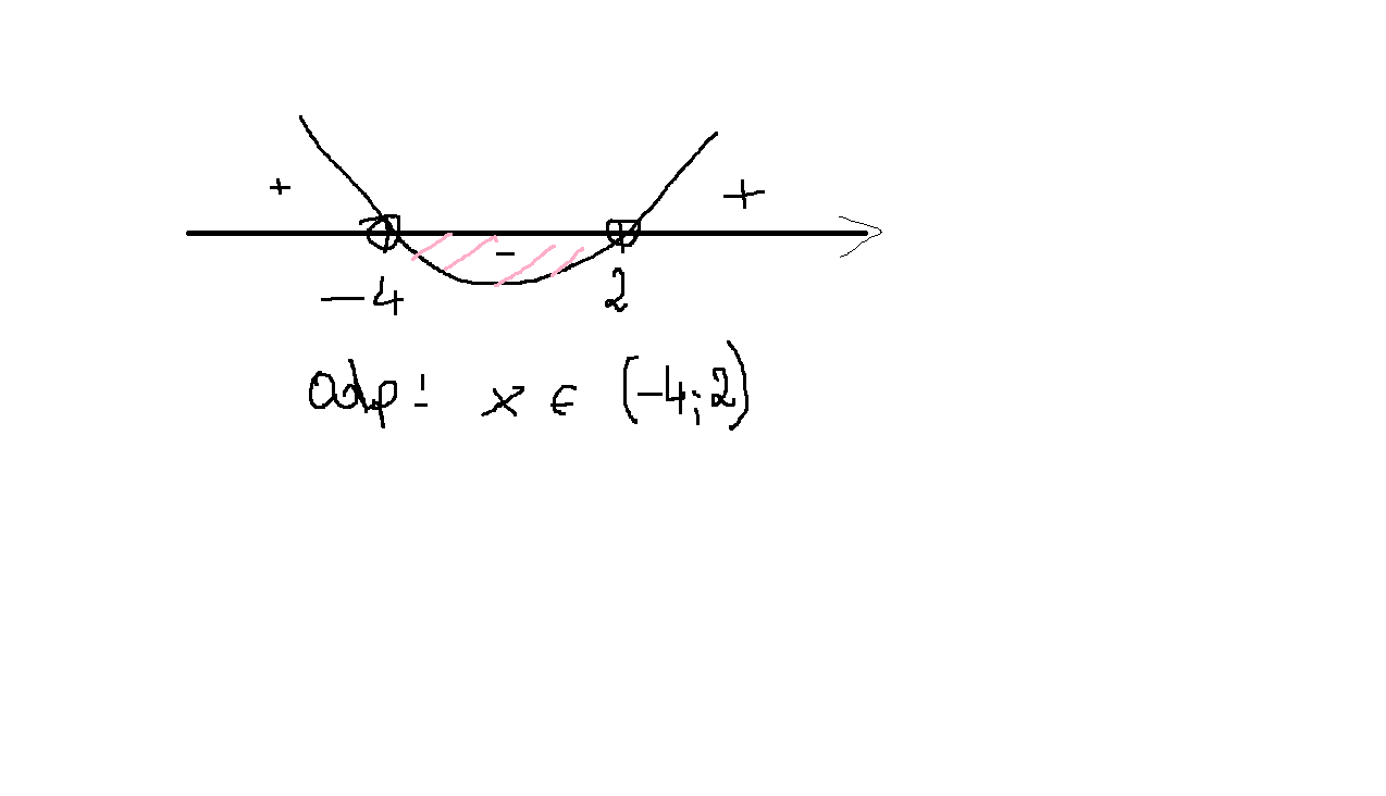 Rysujemy oś liczbowa, zanaczamy miejsca zerowe -4 i 2. rysujemy parabolę o ramionach do góry ( bo a>0) i odczytujemy wartosci ujemne ( czyli gdzie parabola jest pod osią)- załącznik