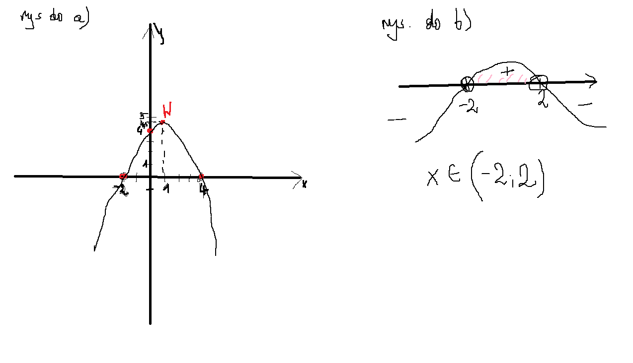 zanaczamy na osi x miejsca zerowe -2 i 4 , zaznaczamy wierzchołek (1; 4,5) i na osi y zaznaczamy 4. rysujemy parabolę przechodzącą przez te punkty.-załącznik