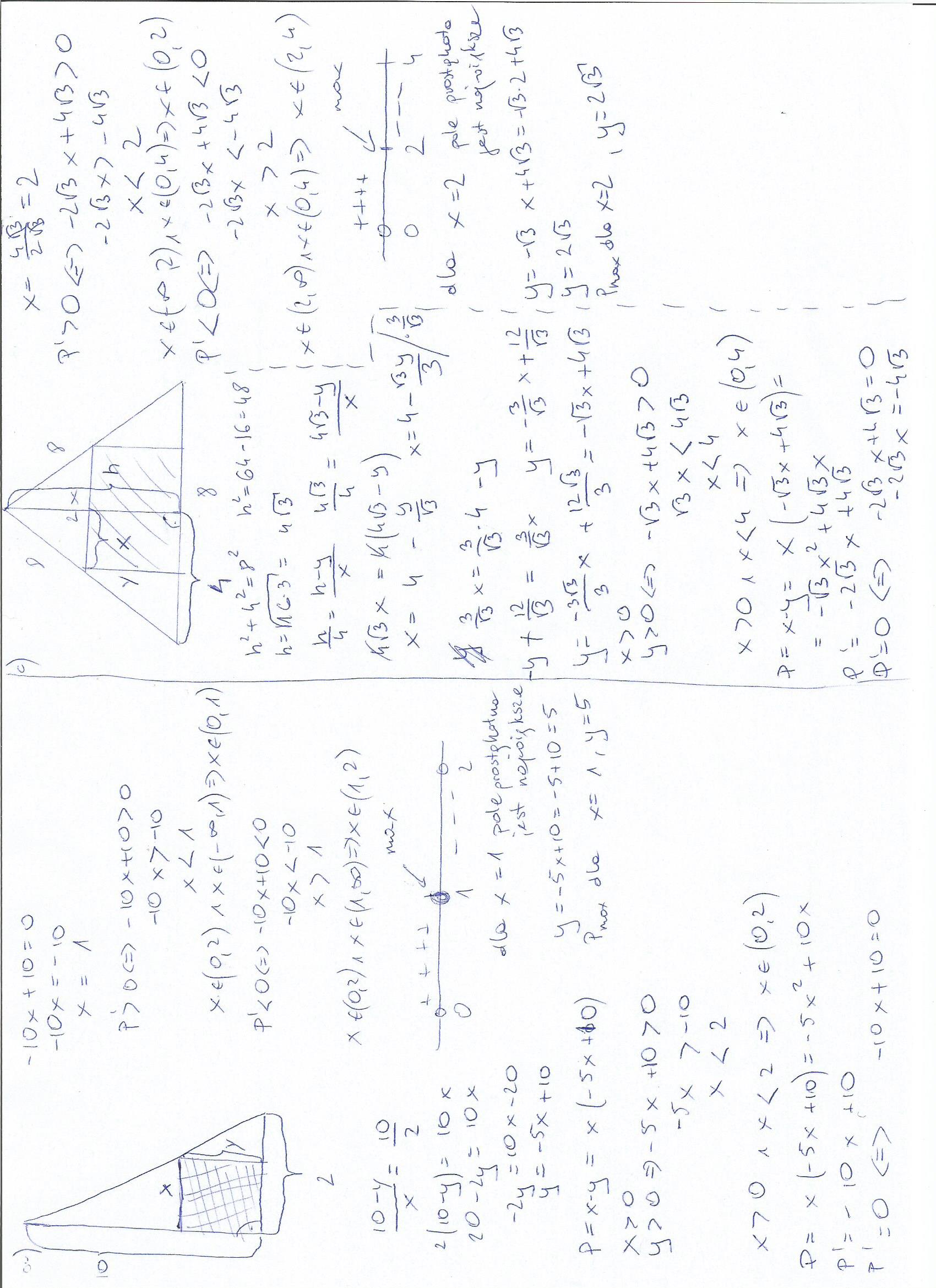 Przedstaw pole P prostokąta (rysunki w załączniku) jako funkcję zmiennej x i podaj jej dziedzinę. Dla jakiego argumentu pole jest największe? Wyznacz wymiary prostokąta o największym polu.