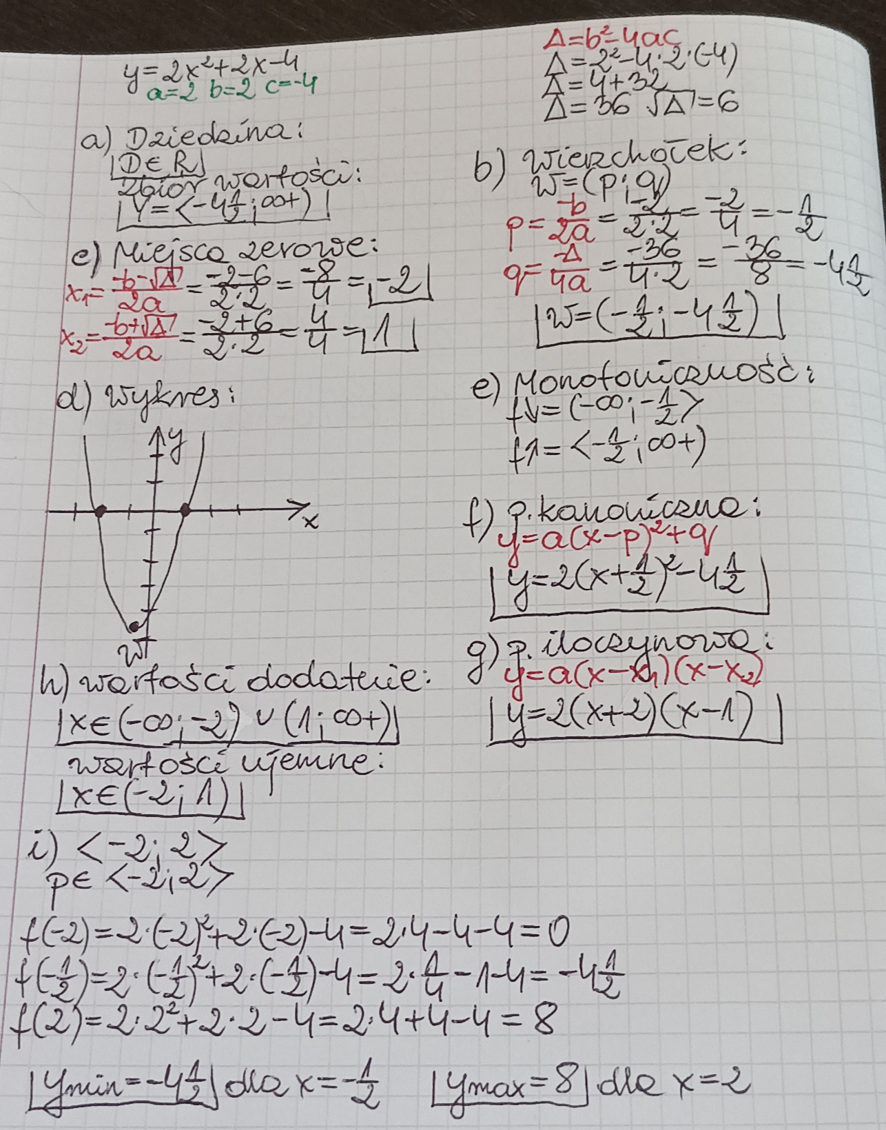 i) podaj największą i najmniejszą wartość funkcji w przedziale <-2,2>.