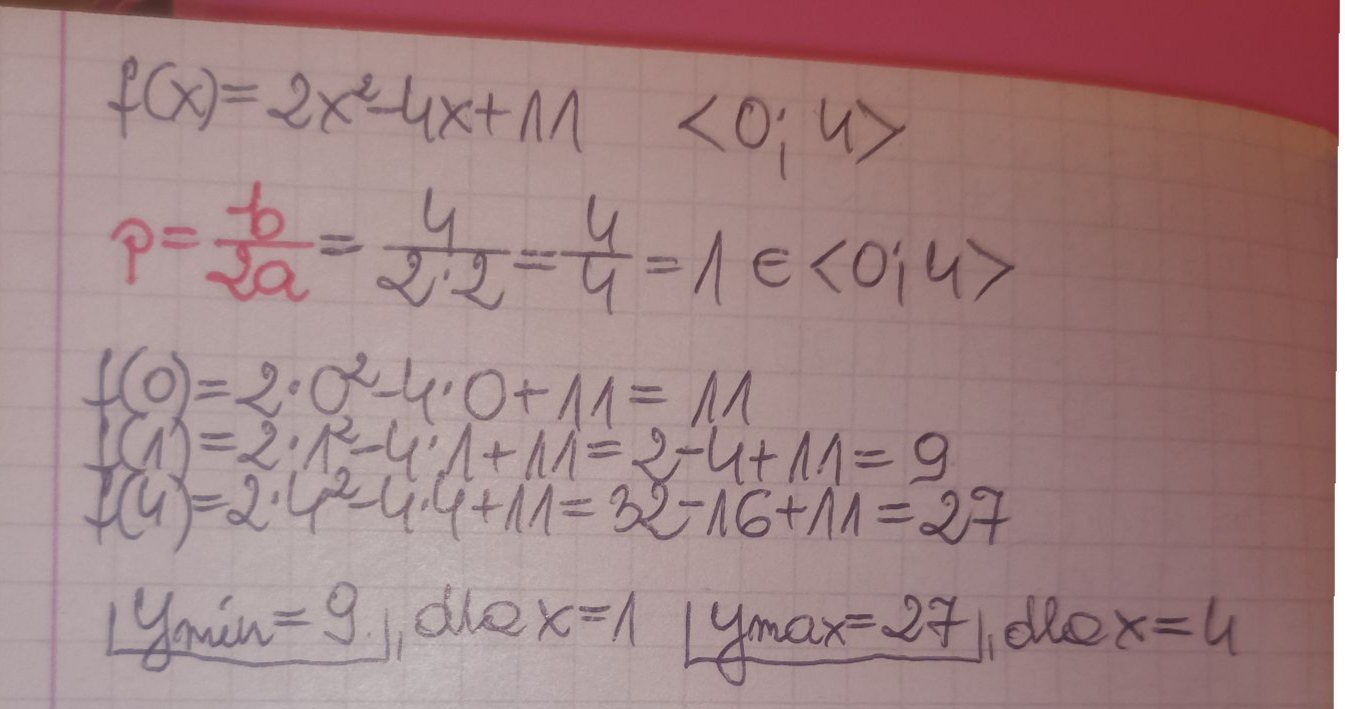 Wyznacz najmniejszą i największą wartość funkcji kwadratowej f(x)=2x^2-4x+11 w przedziale <0;4>