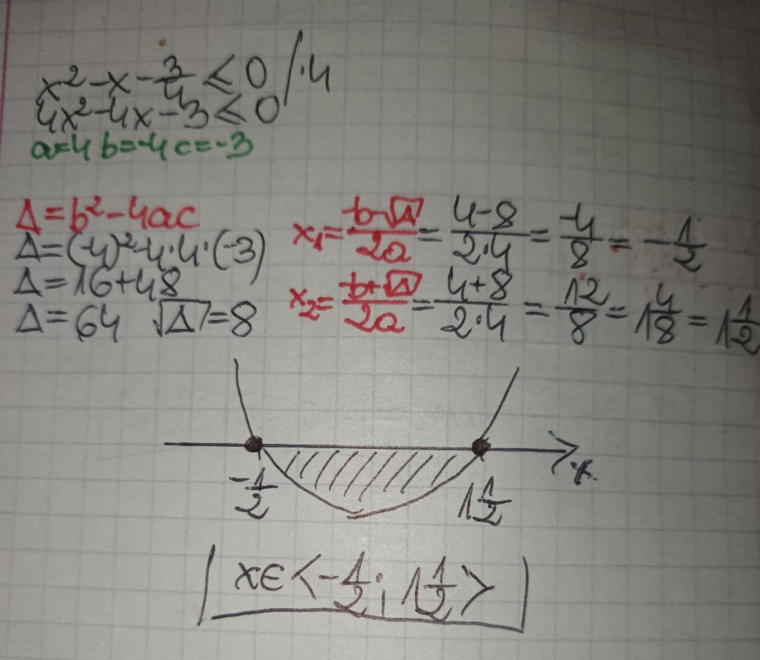 Rozwiąż nierówność x² - x - 3/4 mniejsze bądź równe 0