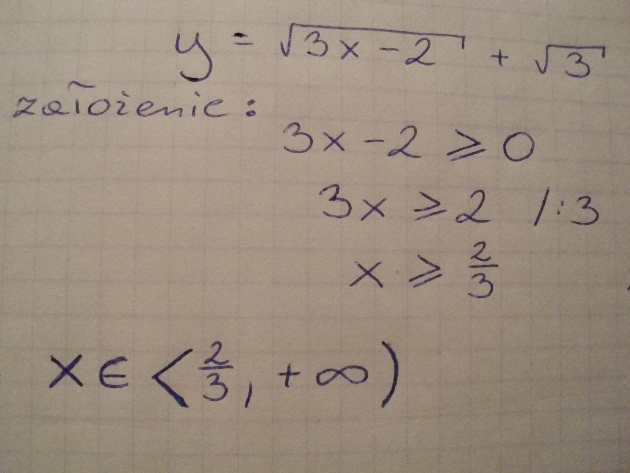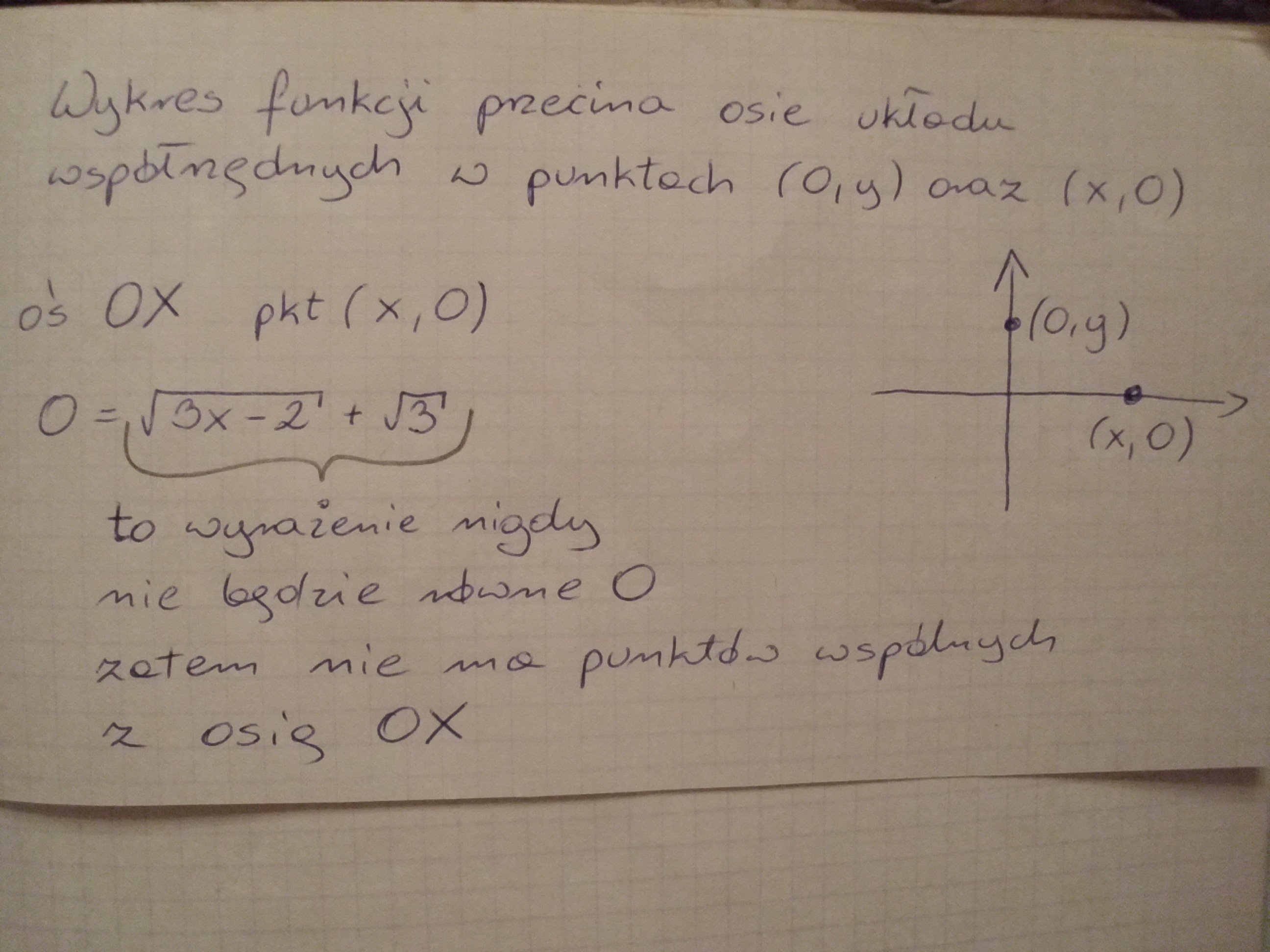 znajdź punkt w którym wykres funkcji y=pierwiastek3x-2+ pierwiastek3 przecina osie układu współrzędnych