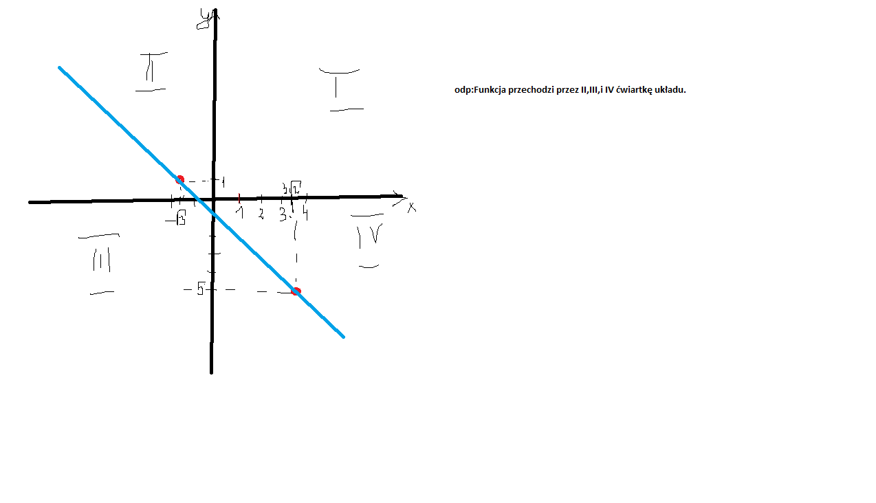 Funkcja f spełnia warunki f(- pierwiastek z 3)=1 i f(dwa pierwiastki z 3)=-5. Wynika z tegp.ze prosta będąca wykresem tej funkcji przechodzi przez nastepujace cwiartki ukladu wspolrzednego.