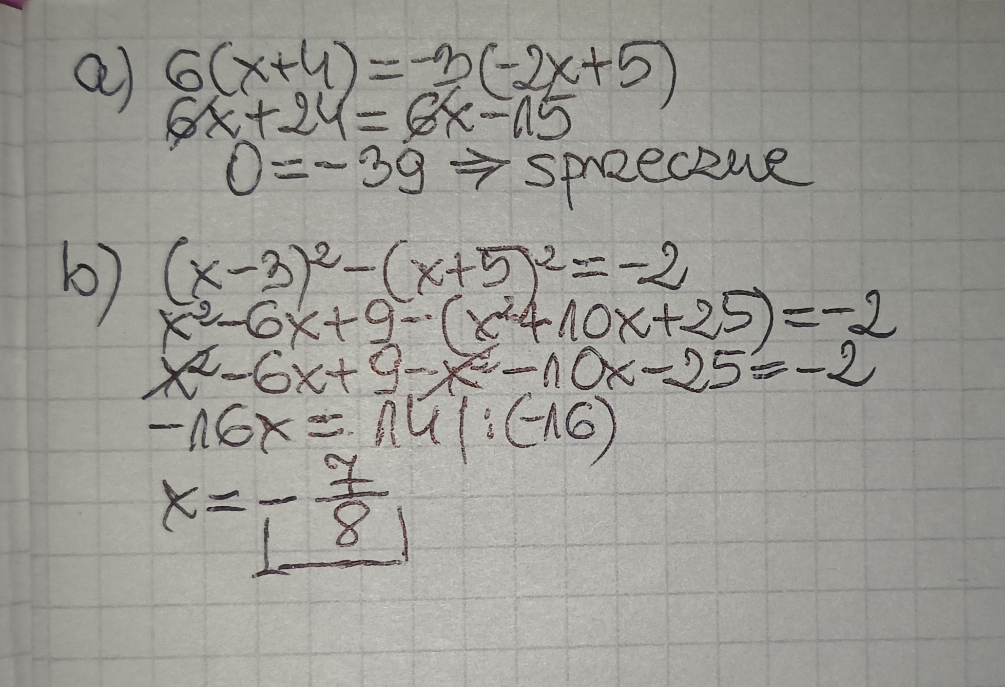 a) 6( x + 4 ) = -3( -2x + 5 )