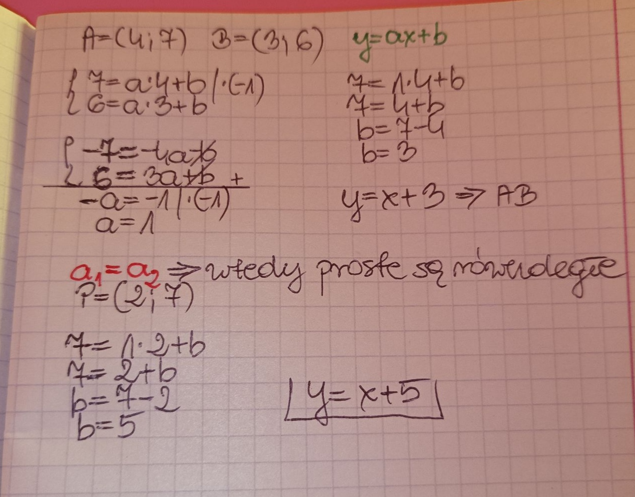 wyznacz rownanie prostej przechodzacej przez punkty A=(4,7)I B=(3,6)oraz znajdz wzor prostej rownoleglej do prostej ABi trzechodzacej przez punkt(2,7)