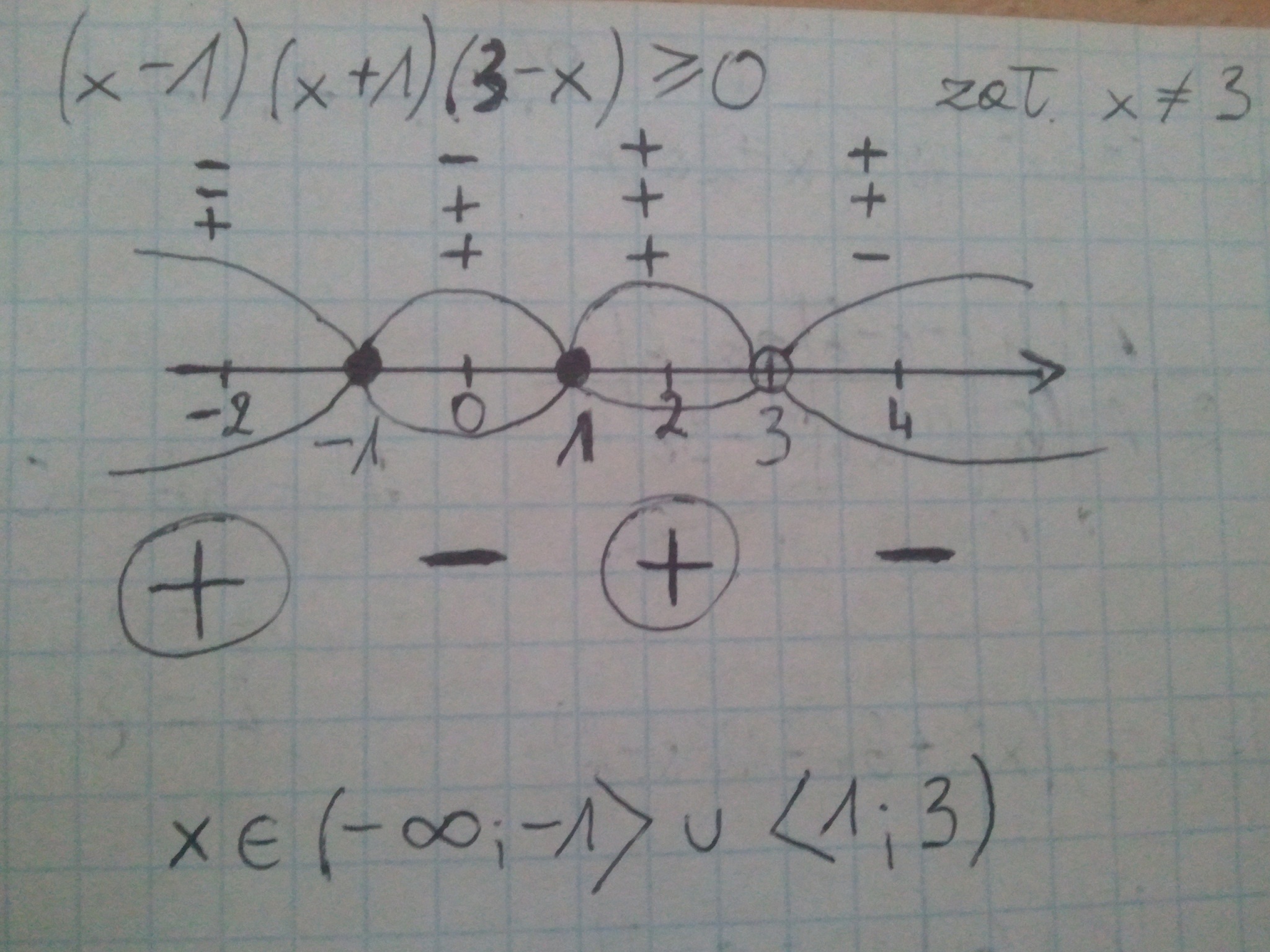 Pierwiastki 1 i -1 należą do przedziału (kółka zamalowane), bo jest większe bądź równe 0.