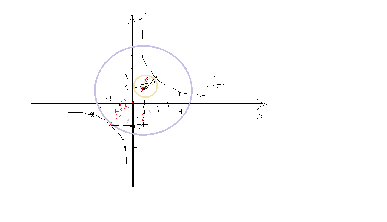 Podaj ile punktów wspólnych ma okrąg o środku w punkcie (1,1) i promieniu "r" z hiperbolą y=4/x. Podaj ile punktów wspólnych mają okrąg i hiperbola w zależności od "r".