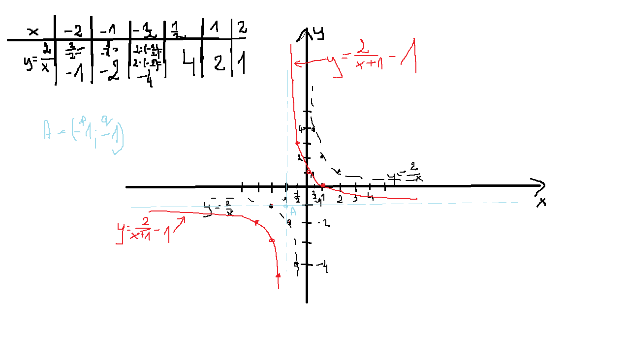 Na czerwono właściwa funkcja ( po przesunięciu tej czarnej o wektor[-1,-1]), zaś na niebiesko są narysowane asymptoty tej czerwonej funkcji.