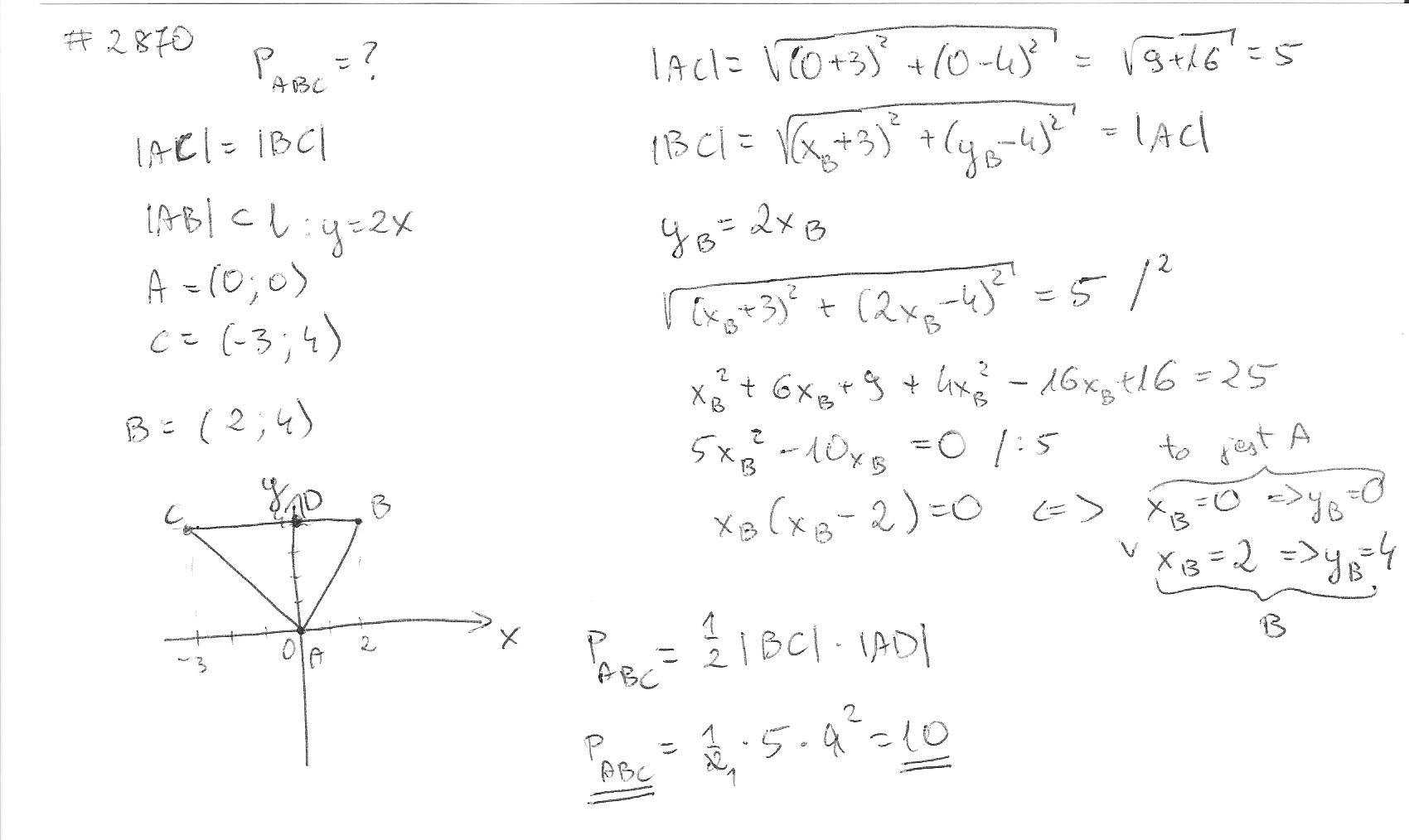 wyznacz ploe trójkąta równoramiennego ABC o ramionach AC i BC, w którym podstawa AB jest zawarta w prostej o równaniu y=2x a dwa wierzcholki maja współrzędne A=(0,0)