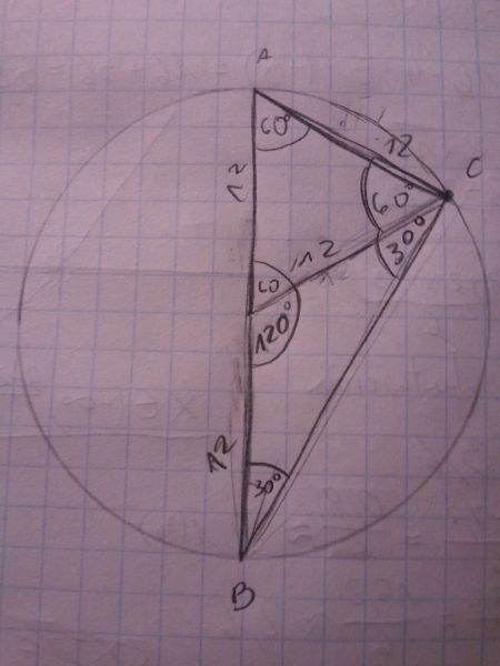 Dany jest okrąg o promieniu 12. Miara kąta między średnicą AB a cięciwą BC jest równa 30 stopni. Wtedy cieciwa AC ma dlugosc :