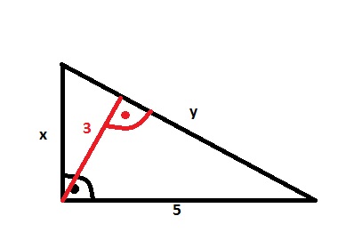Oblicz pole i obwód trójkąta prostokątnego, w którym jedna przyprostokątna ma długość 5cm, a wysokość opuszczona z wierzchołka kąta prostego ma długość 3cm.