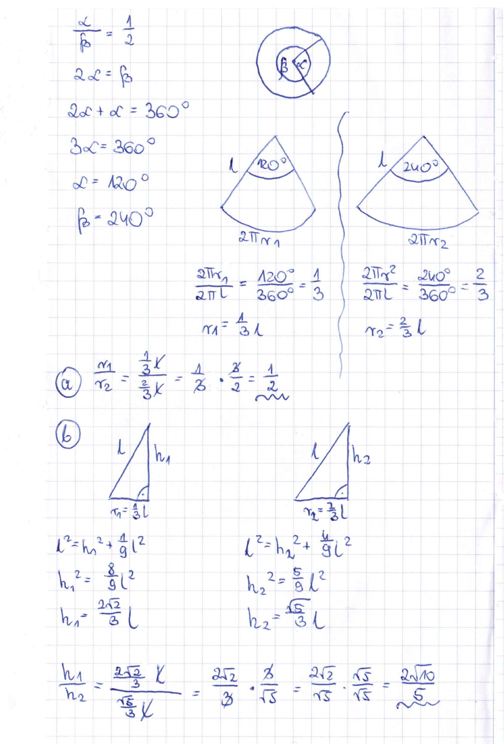 b) stosunek długości wysokości tych stożków