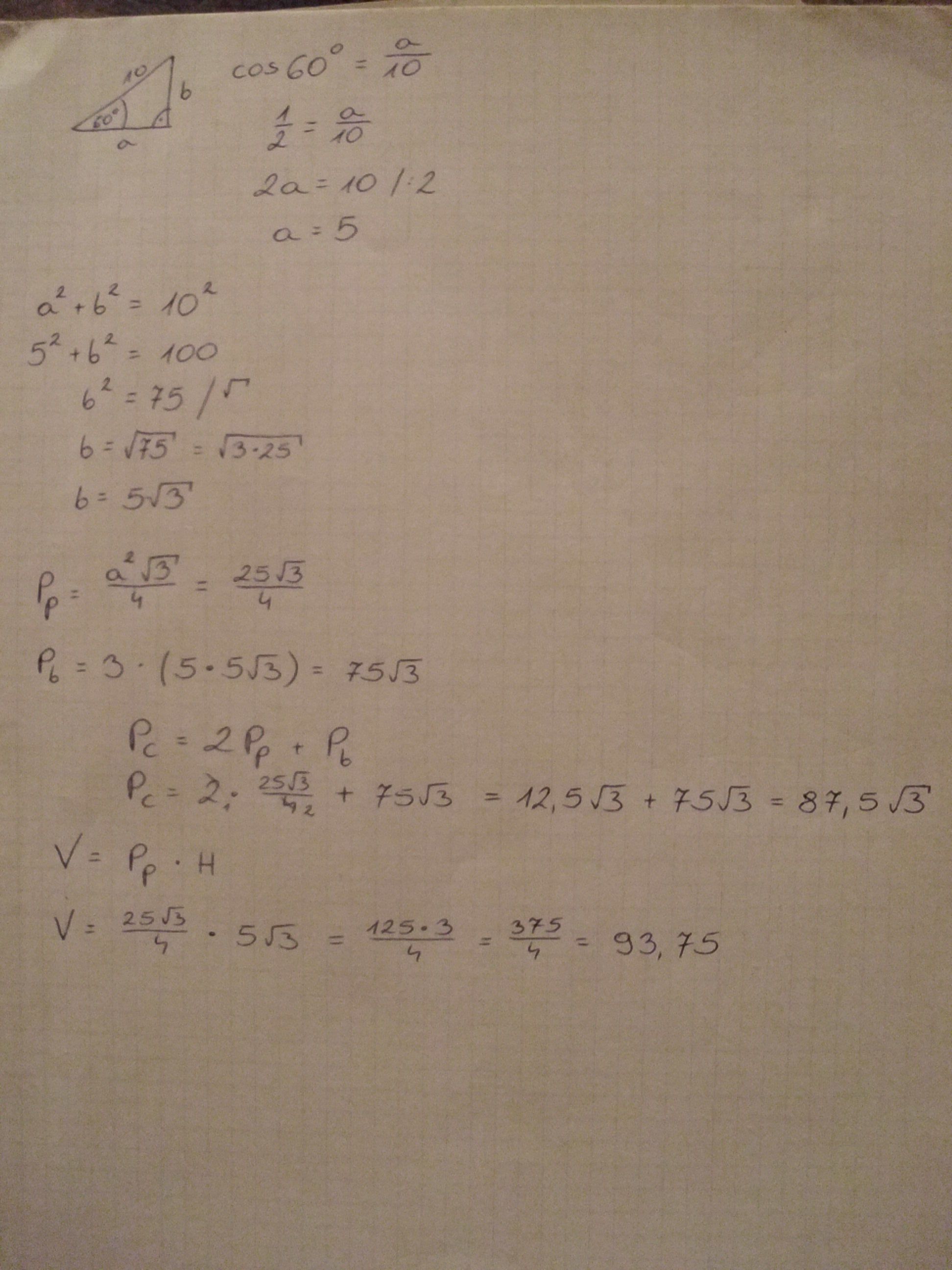 oblicz pole i objętość graniastosłupa prawidłowego trójkątnego,wiedząc,że przekątna ściany bocznej długości 10 tworzy z krawędzią podstawy kąt