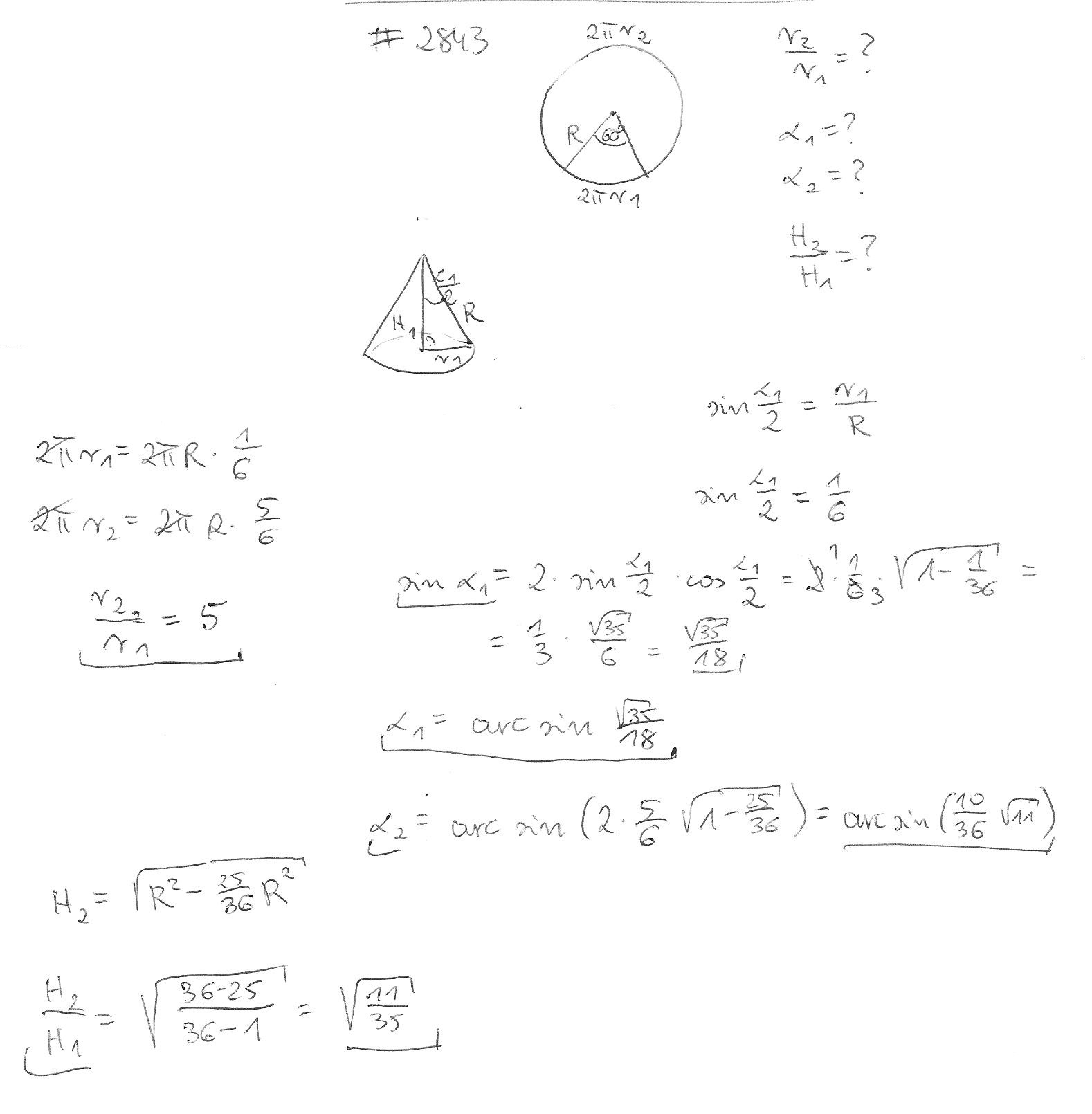 Koło podzielono na dwa wycinki kołowe o kątach środkowych 60 stopni i 300 stopni. Z każdego z tych wycinków tworzymy powierzchnię boczną stożka.