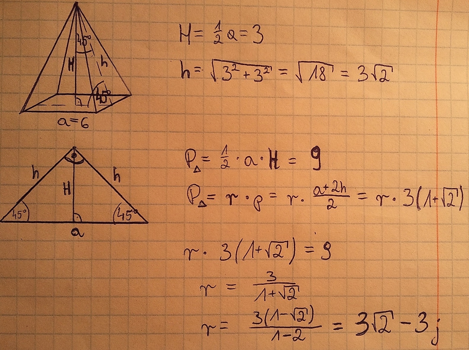 Krawędź podstawy ostrosłupa prawidłowego czworokątnego ma długość 6, a jego ściany boczne są nachylone do podstawy pod katem 45 stopni. Oblicz promień kuli wpisanej w ten ostrosłup.