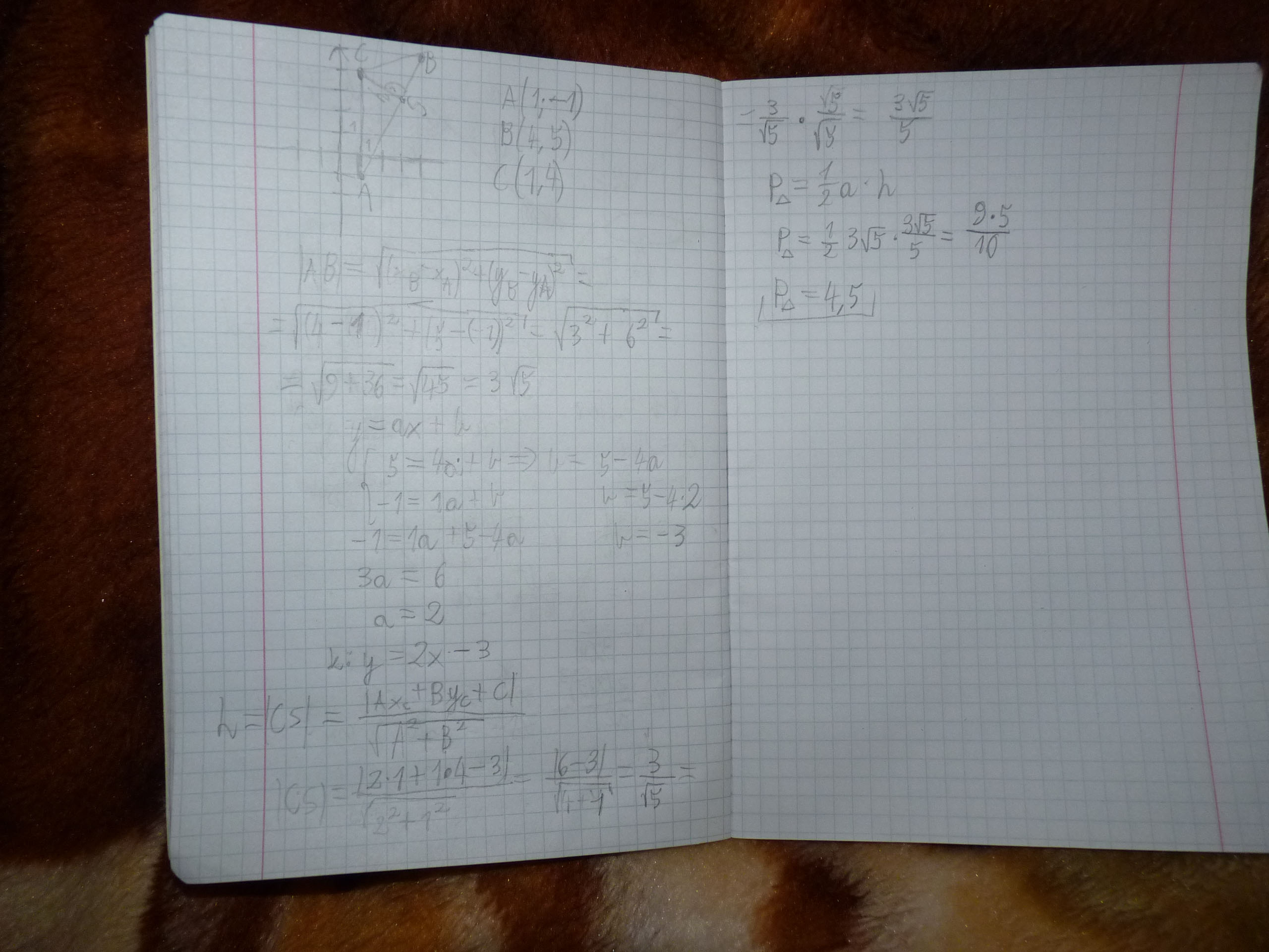 zad.1Oblicz pole trójkąta wyznaczonego przez punkty A(1;-1) :B(4,5); C(1;4).