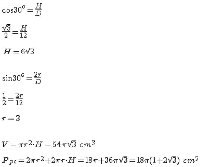 Przekątna przekroju osiowego walca ma długość 12 cm i tworzy z wysokością kąt 30 stopni.