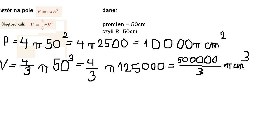Oblicz pole powierzchni i objętość kuli wiedząc że jej promień jest równy 50cm.