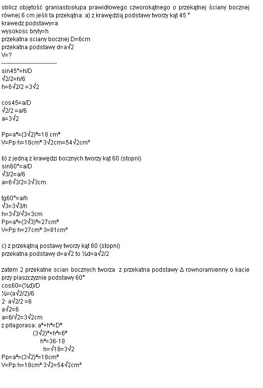 Oblicz objętość graniastosłupa prawidłowego czworokątnego o przekątnej ściany bocznej równej 6 cm, jeżeli ta przekątna :