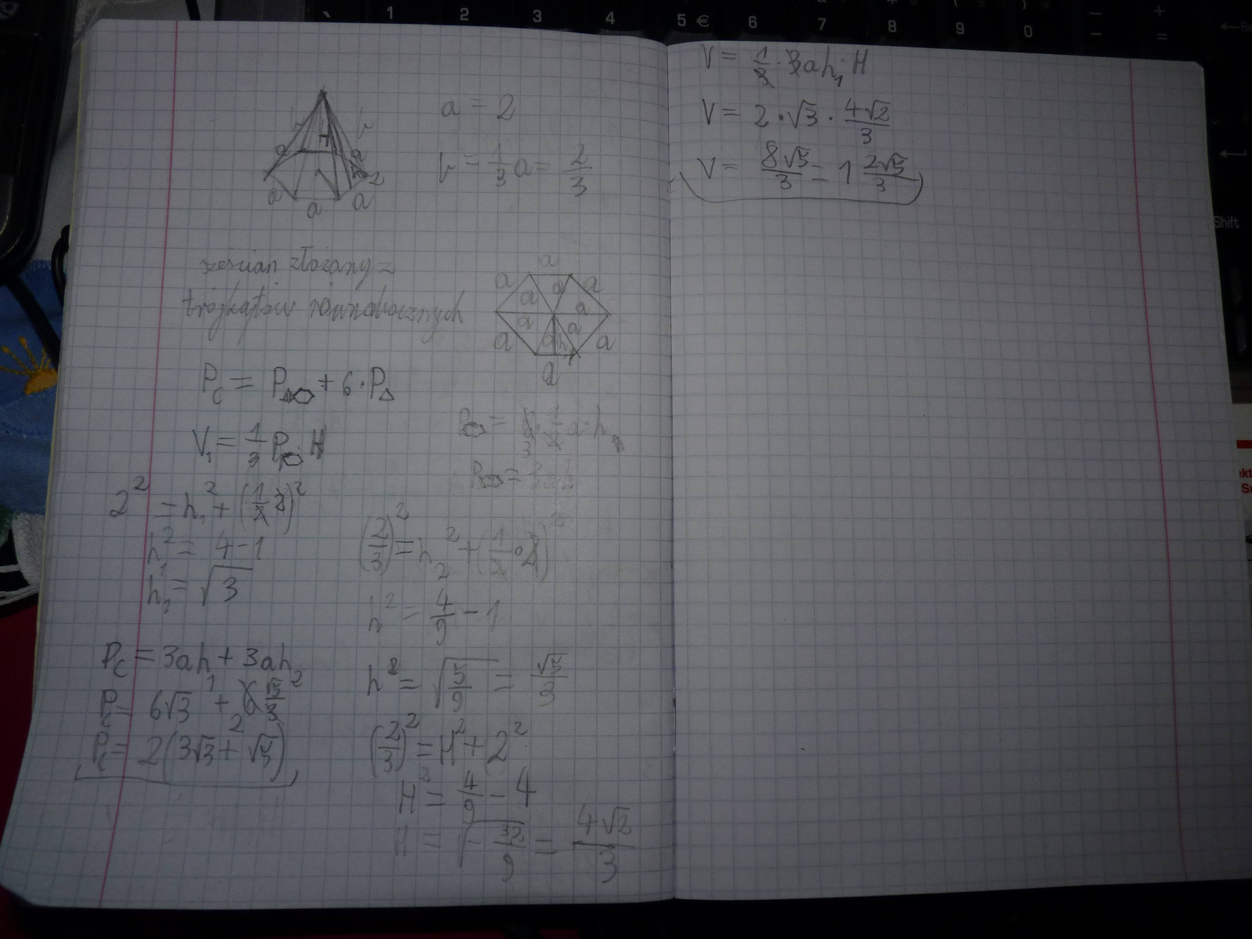 W ostrosłupie prawidłowym sześciokątnym krawędź podstawy jest równa 2 i jest trzy razy krótsza od krawędzi bocznej. Oblicz objętość i pole powierzchni całkowitej tego ostrosłupa