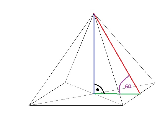 Ostrosłup ten ma w podstawie kwadrat. Zielony odcinek jest równy połowie długości krawędzi podstawy (czyli połowie długości boku kwadratu)