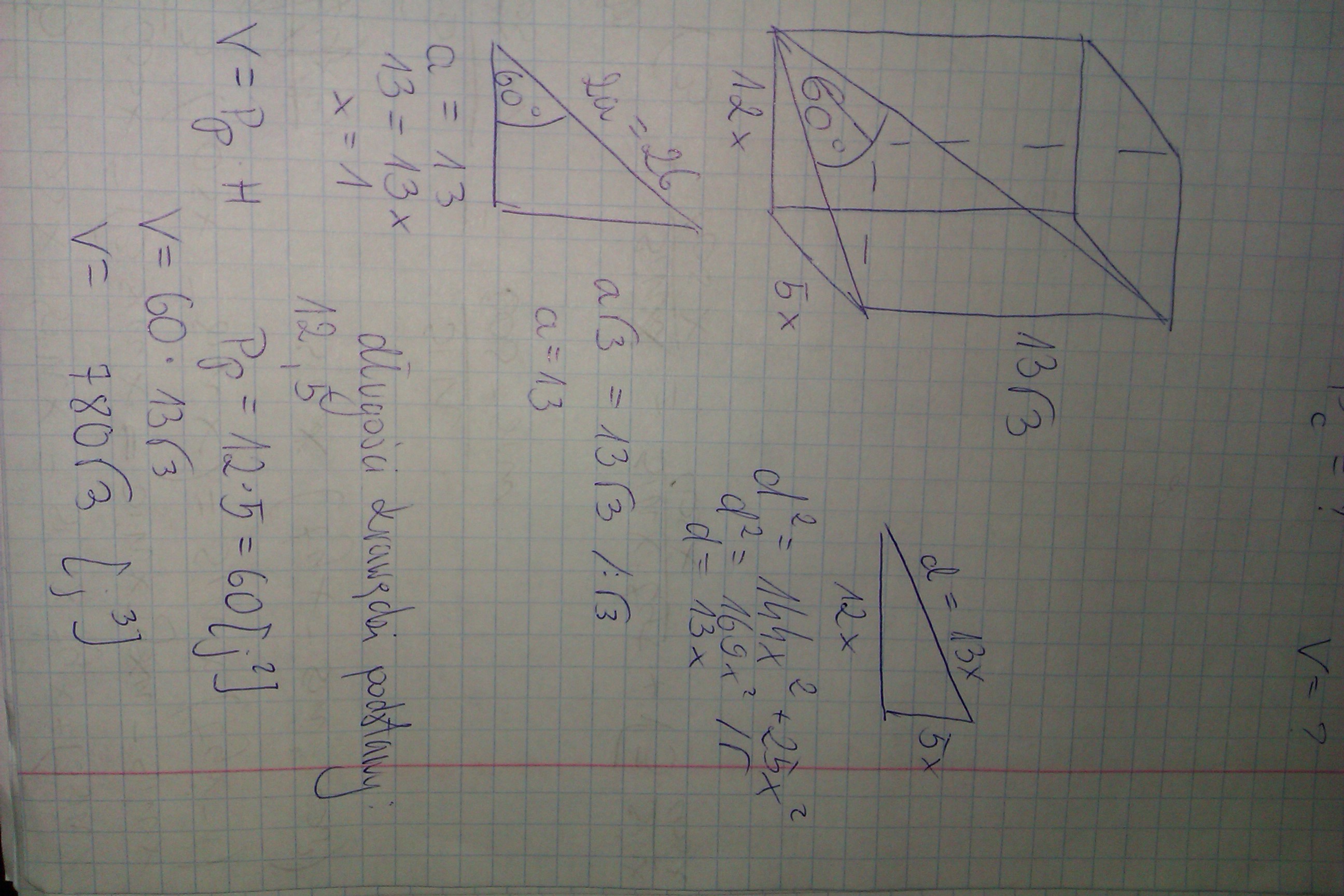 W prostopadłoscianie przekątna bryły jest nachylona do podstawy pod kątem 60 stopni. Oblicz pole powierzchni i objętość tej bryły, jeśli jej wysokość wynos13√3, a krawędzie podstawy sa w stosunku 12:5. ?