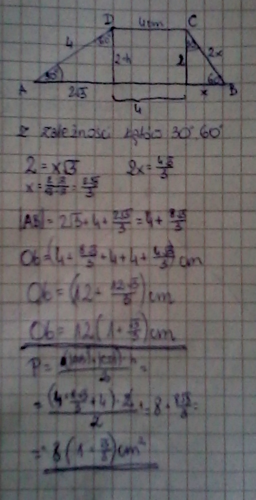Krótsza podstawa trapezu nierównoramiennego ma 4 cm długości,wysokość trapezu wynosi 2cm.Oblicz obwód i pole,wiedządz,że kąty między ramionami,a dłuższą podstawą mają;30stopni i 60 stopni.