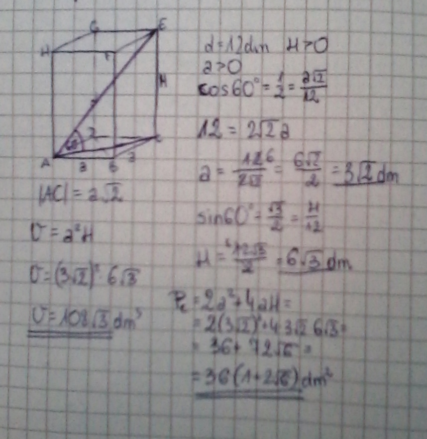 Oblicz objętość i poler powierzchni całkowitej graniastosłupa prawidłowego czworokątnego,którego przekontna długości 12 dm tworzy kąt 60stopni z powierzchnią podstawy.