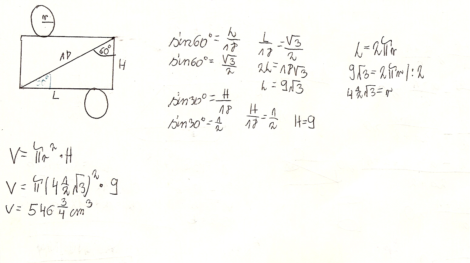 tworzy z bokiem odpowiadącym wysokości walca kąt o mnierze 60 stopni, Oblicz objętość walca.