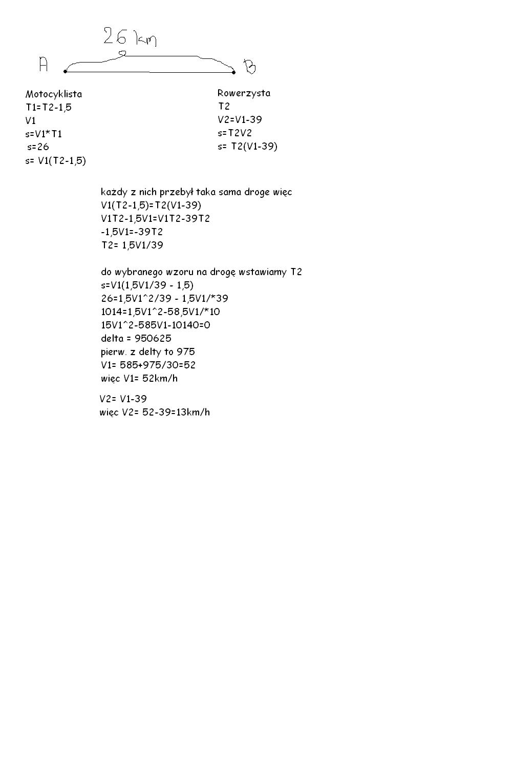 Droga z miejscowości A do miejscowości B ma długość 26km.Motocyklista przebył tę drogę w czasie o 1,5h krótszym niż rowerzysta,ktory jechał z prędkością o 39km/h