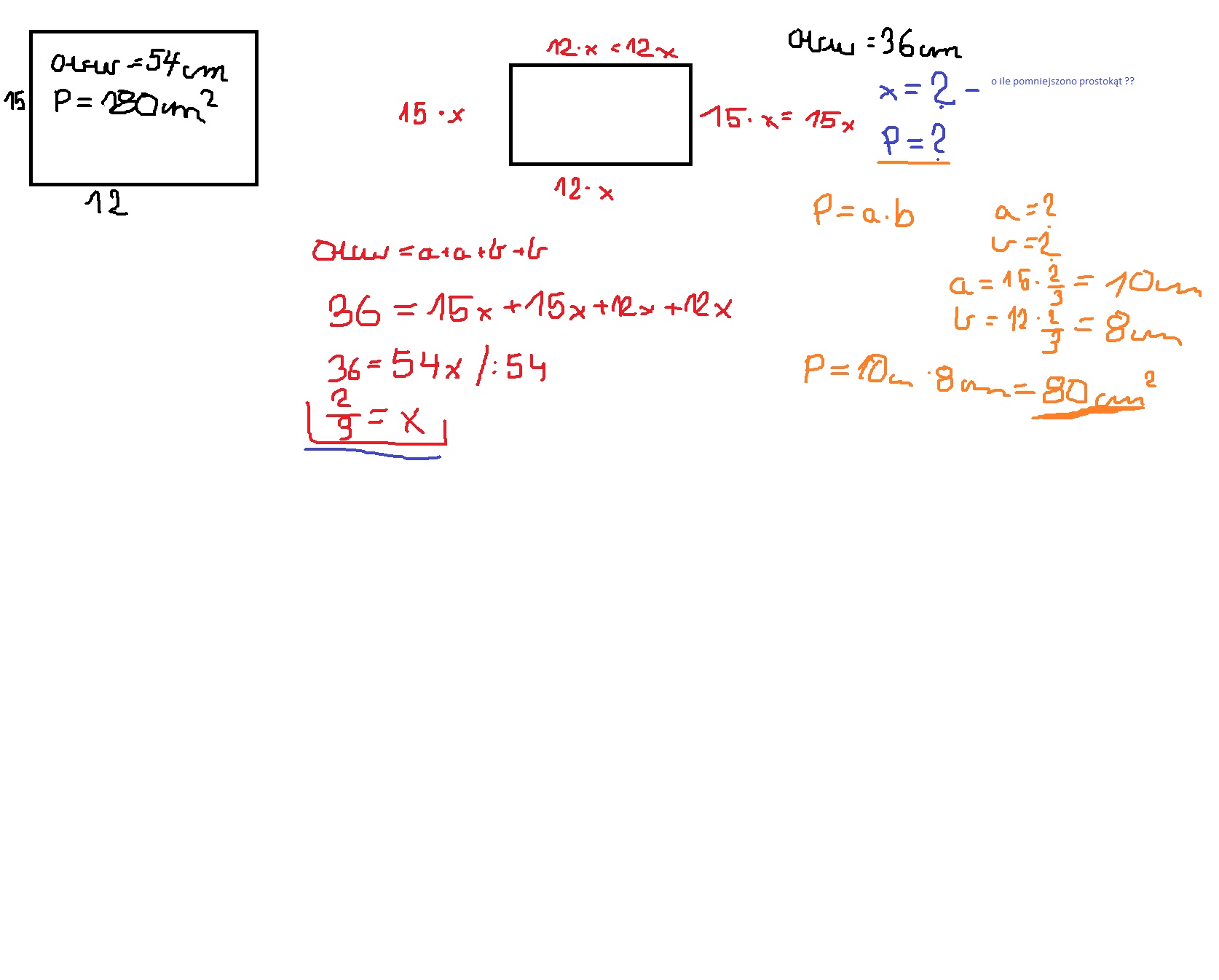 zad1) prostokąt o bokach długości 12 cm i 15 cm jest podobny do prostokąta o obwodzie 36 cm. oblicz pole mniejszego prostokąta.