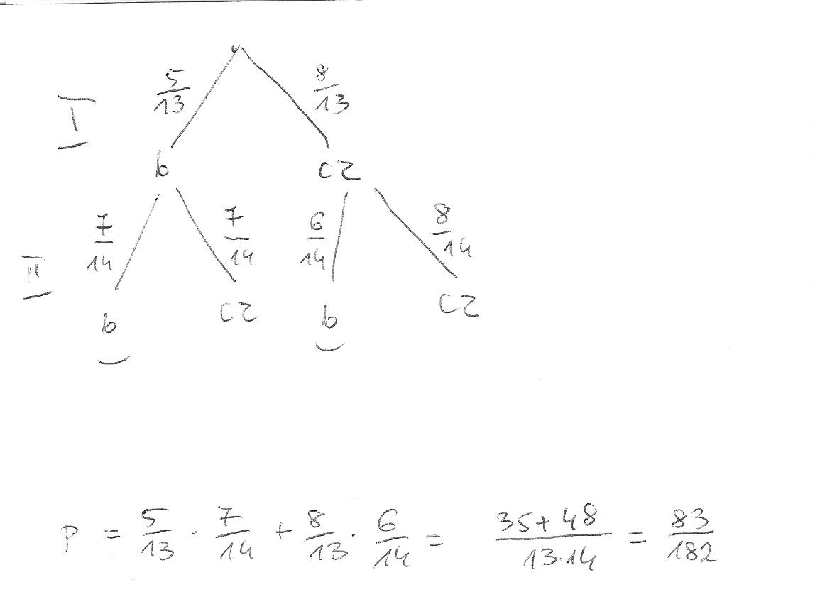 Z pierwszego pudełka , w którym znajduje się 5 kul białych i 8 kul czarnych losujemy jedną kulę i przekładamy ją do drugiego pudełka , w którym początkowo znajduje się 6 kul białych i 7 czarnych. Po wymieszaniu kul w drugim pudełku losujemy z niego jedną kulę . Narysuj drzewko ilustrujące przebieg losowań i oblicz prawdopodobieństwo , że z drugiego pudełka wylosujemy kulę białą.