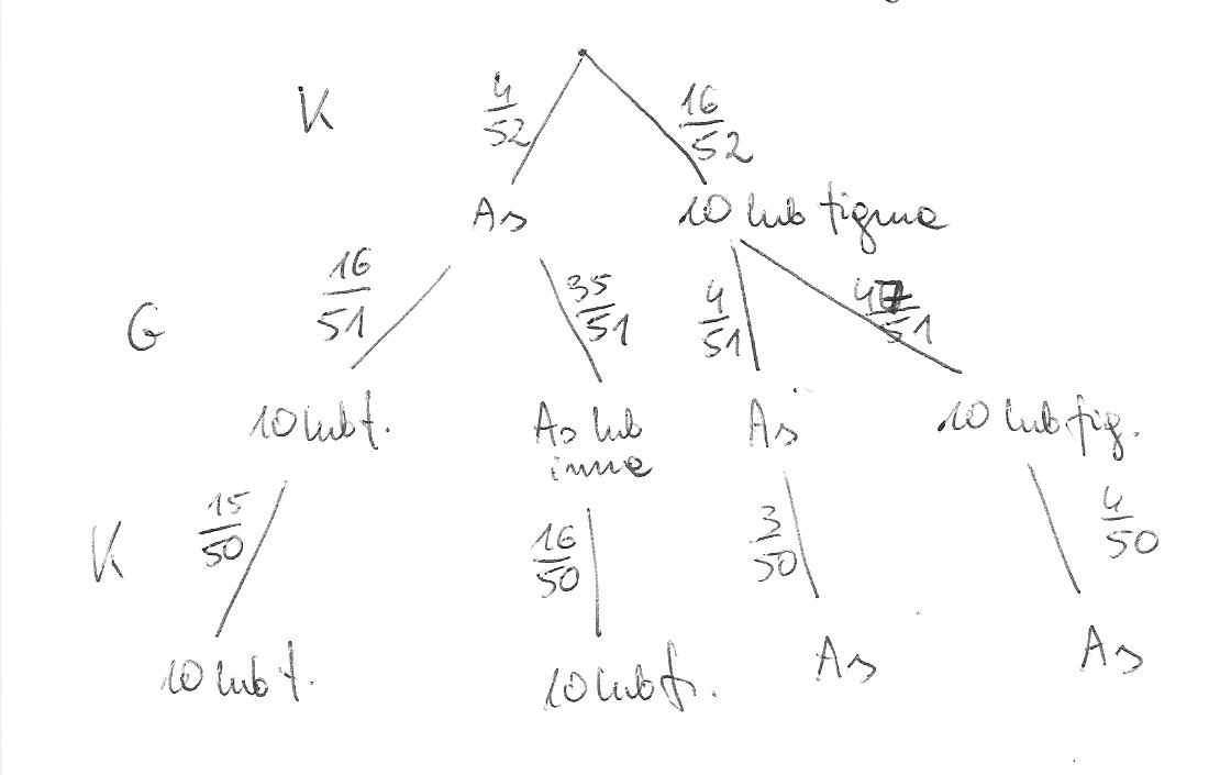Poprzednie moje rozwiązanie było chyba niepełne, bo nie uwzględniłam tego, że gracz też dostaje karty. Tu trzeba chyba rozrysować dwa drzewka - kiedy najpierw kartę dostaje gracz, i drugie kiedy najpierw dostaje krupier. To drugie w załączniku - rysowałam tylko te gałezie, które dla efektu końcowego są ważne. Wtedy prawdopodobieństwo dla tej części byłoby: