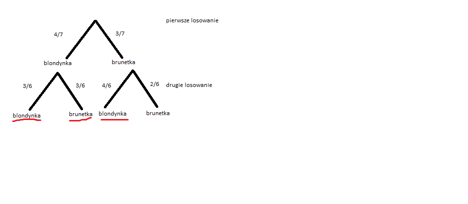 Przy kreskach napisane są prawdopodobieństwa, z jakimi wybierzemy daną dziewczynę. W drugim losowaniu jest już o jedną mniej dziewczynę do wybrania, więc ułąmki się zmienią odpowiednio.