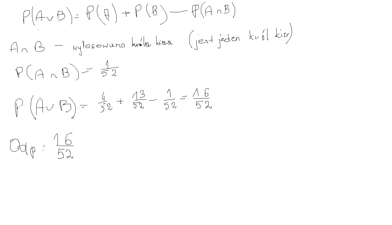Z talii 52 kart losujemy jedną. Prawdopodobieństwo, że wylosujemy króla lub kiera, jest równe :