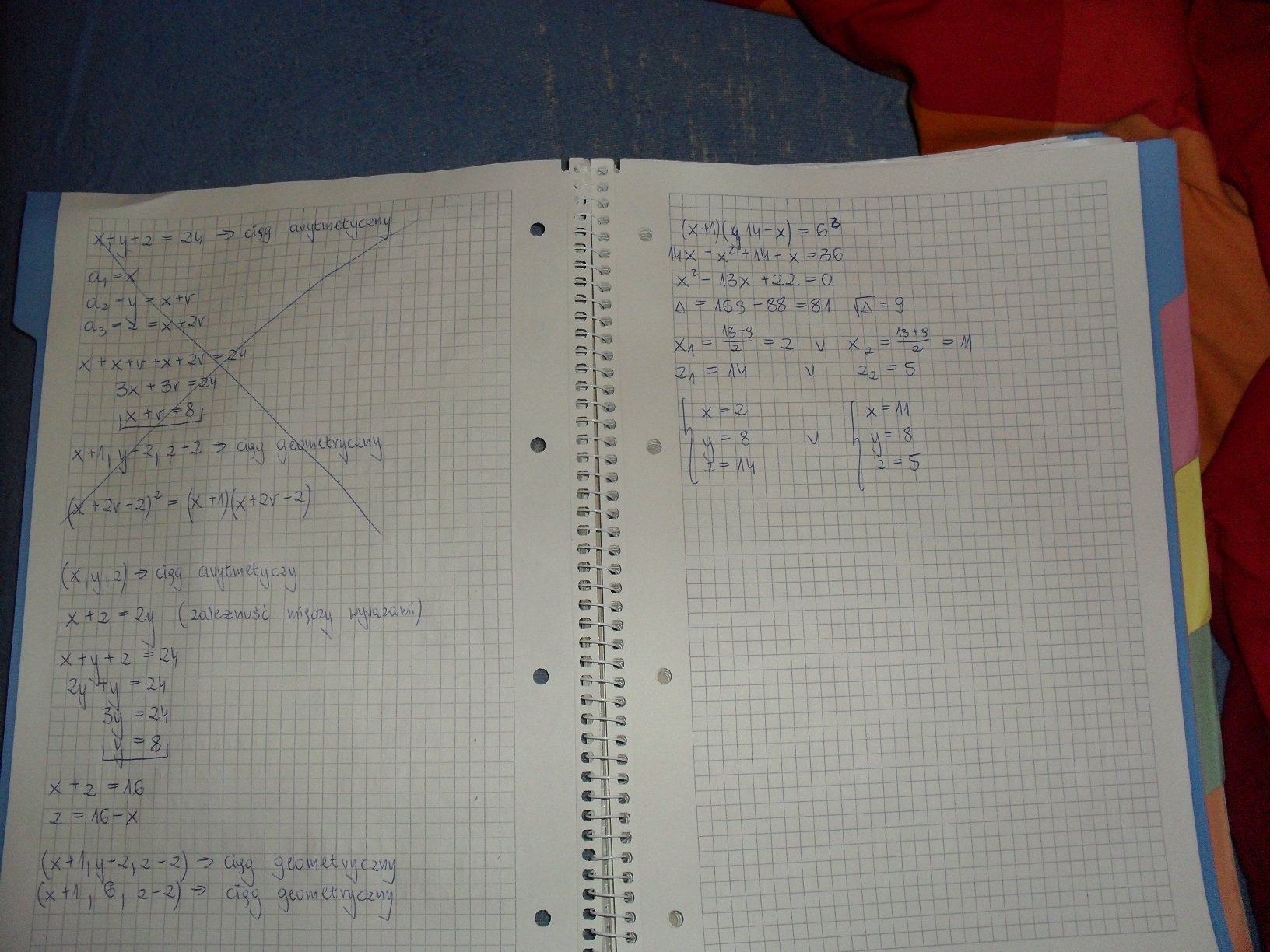 Trzy liczby x,y,z których suma wynosi 24 tworzą ciąg arytmetyczny. Liczby x+1, y-2,z-2 tworzą ciąg geometryczny. Znajdz liczby x,y,z