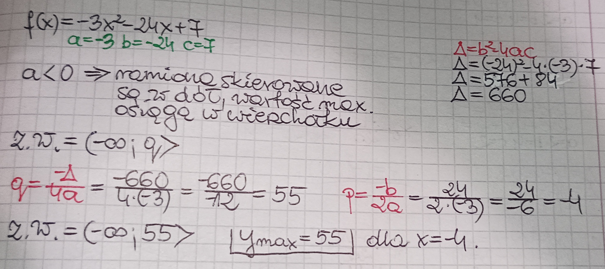 Podaj najwieksza liczbę całkowita nalezaca do zbioru wartości funkcji f(x)=-3x 2 -24x +7