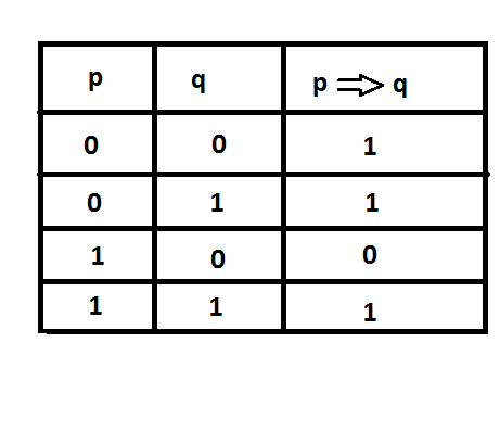 Implikacja jest zdaniem fałszywym, tylko wtedy, gdy zdanie p jest prawdziwe(1), a q fałszywe(0).