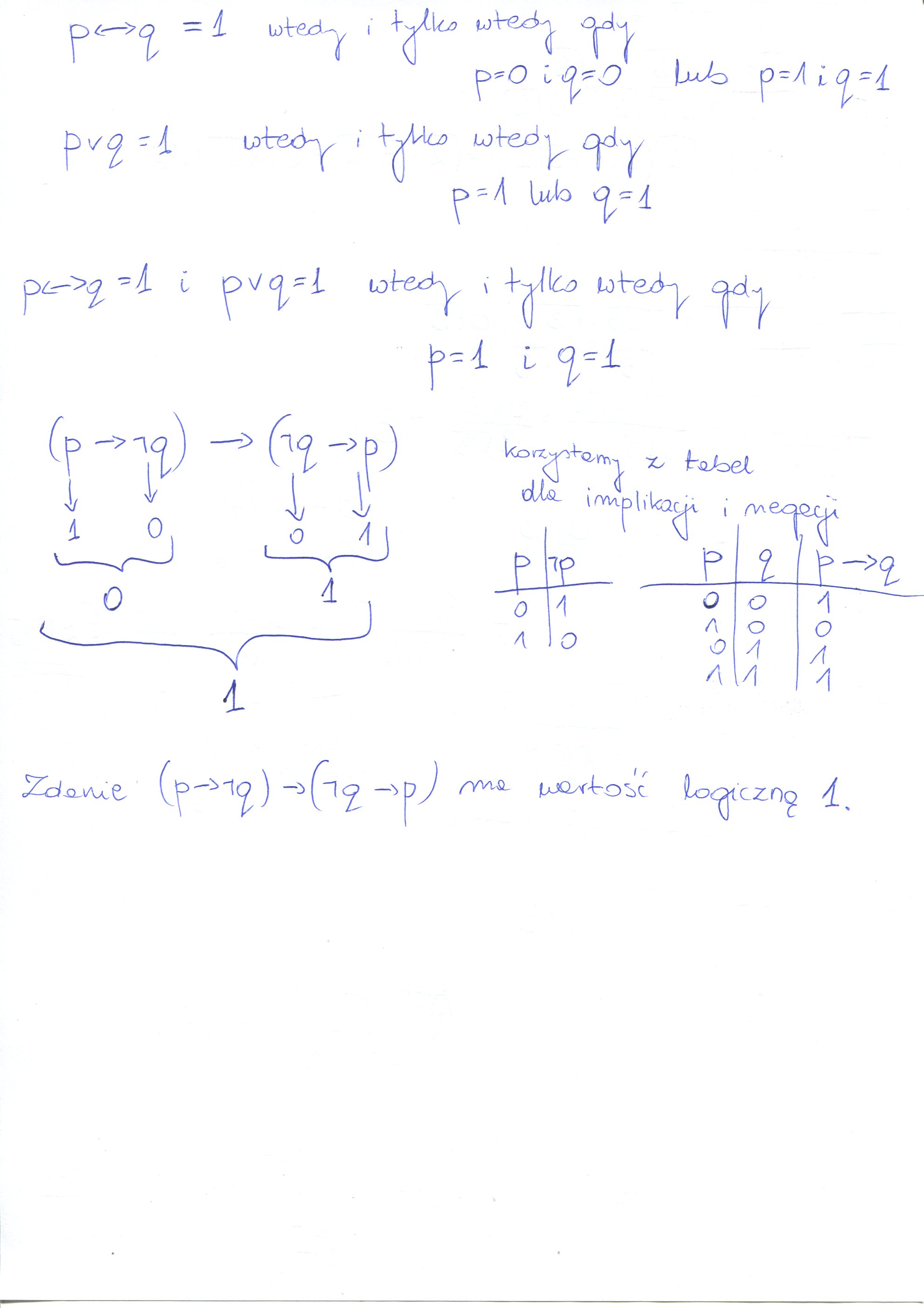 Wiadomo, że w (p<=>q)=1 i w (p \vee q)=1. Jaką wartość logiczną ma zdanie: [p=> ~ q] => [ ~q => p]