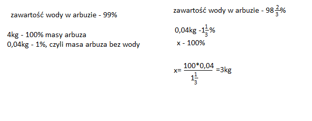 Świeży arbuz waży 4kg. W wyniku przechowywania ilość wody w arbuzie zmniejszyła się z 99% do 98 i 2/3%. Jak zmieniła się masa tego arbuza.